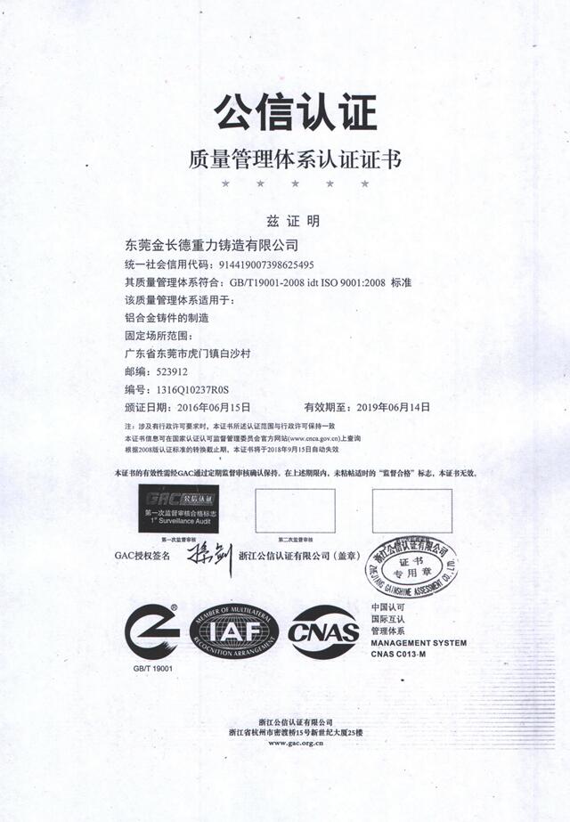 東莞金長德重力鑄造有限公司始建于1990年,是一家專業從事鋁合金重力鑄造、低壓鑄造、砂型鑄造的企業。位于廣東省東莞市虎門鎮白沙一村,已經有三十多年的歷史,專業從事于鋁合金鑄件的生產和加工。我司除了自己設計制作各種鑄造類模具外,鑄造和機械加工為一體是我公司的另外一個生產特色。我們可以根據客戶的要求,來樣,來圖進行模具的設計和產品的生產,做出各種毛胚件和成品件。還有自動射芯機,拋丸機,噴砂機,熱處理機器多臺,CNC數控加工中心,銑床等設備。 我司的產品領域包括了新能源電機、機器人零件、汽摩配件,火車零件,機械零件,馬達風機,空壓機系列,印刷機械零件,木工和醫療器械零件等類型,產品出口到意大利,法國,美國,英國,以色列,日本,臺灣等國家和地區,深受國內外客戶的認可和好評。